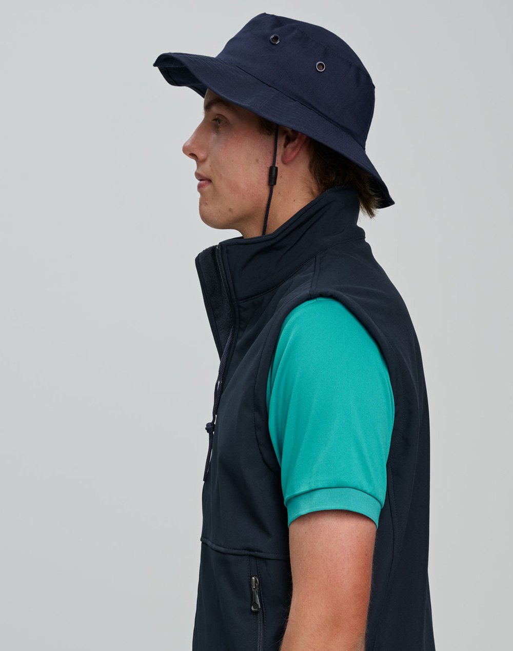 Description: UPF rating 50+. "Excellent Protection". Meets AS/NZS 4399:1999. Poly/ Cotton fabric with soft brim. Large metal eyelets for ventilation. Toggle and break-away clip on chin strap.